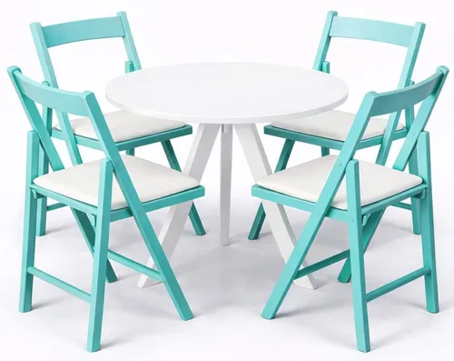 שולחן פריז לבן קוטר 70 ס"מ + 4 כסאות מתקפל תכלת